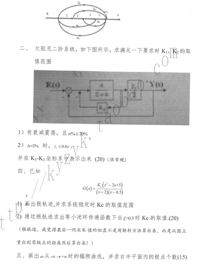 貌似是G(s)=K/s(s+2)(s+7)这个传函,第一问画出根轨迹(求始末位置、根轨迹条数-3条、实轴上根轨迹存在区间、渐近线、分离点、与虚轴交点);第二问,问的是K值范围,劳斯判据~;第三问 ...