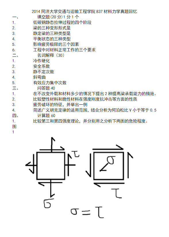 2014年吉林大学材料力学考试大纲(工学部通用) 考试的章数为1-14章。 第3章第9节不考弹簧应力和变形不考。 第4章第6节叠加法做弯矩图不考。 第5章第5节弯曲理论对某些问题的扩充不考。 第6章叠加法求弯曲变形不考。 第7章第10节莫尔强度理论和双剪理论不考。 第9章不考。第10章第3节不考虚功原理不考。 第13章8节不 ...专业课考研资料 本站小编 免费考研网 2015-12-12吉林大学考研材料力学题型二:弯曲强度及变形