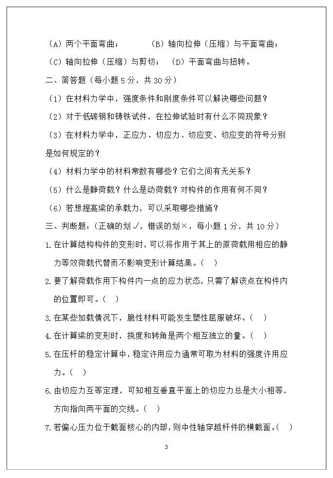 专业课考研资料 本站小编 免费考研网 2016-01-02西南科技大学2011——2012学年材料力学考研试题