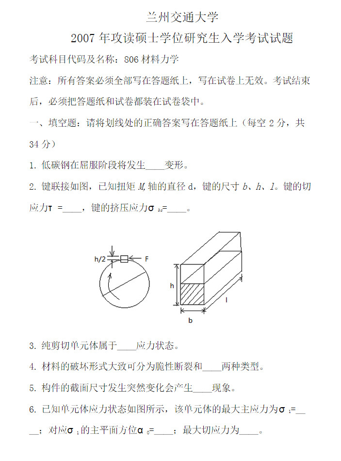 兰州交通大学2007材料力学806考研真题