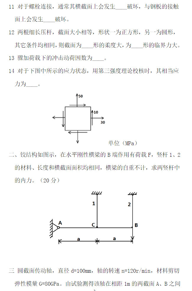 专业课考研资料 本站小编 免费考研网 2016-01-032010同济大学材料力学回忆版考研试题