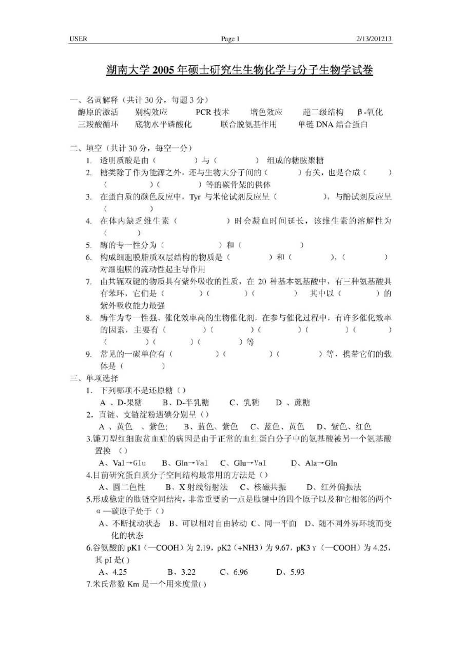 2012年 628生物化学大题 满分150 五、简答题:(每题10分,共50分) 1、PCR的英文全称是什么?在基因进行PCR扩增过程中涉及到哪些要素?其中哪些因素决定了RPC的效率? PCR要素:底物,模板,引物链,DNA聚合酶,Mg离子 2、列举10种蛋白质翻译后化学修饰的方式. 去除信号肽序列,亚基聚合,水解断链 ...