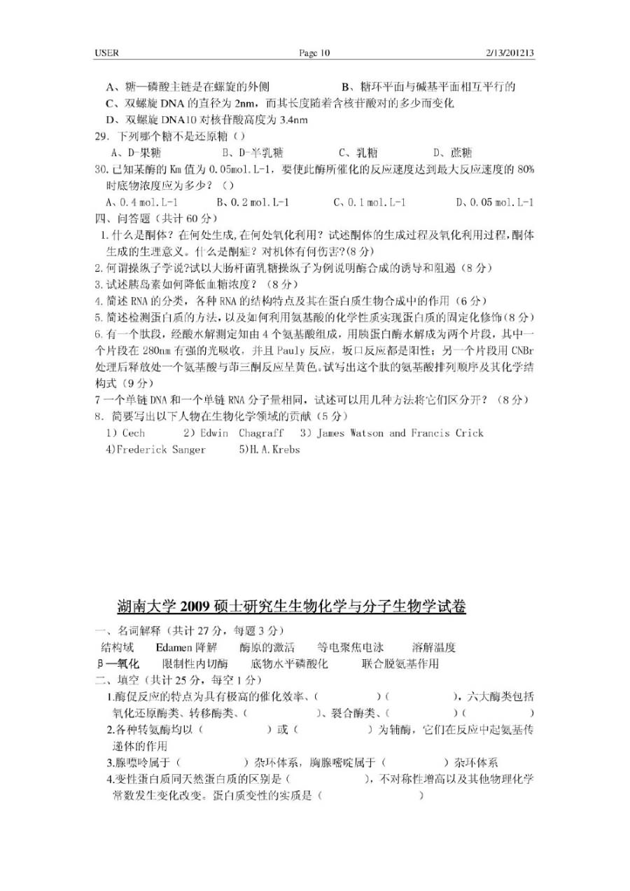 2012年 628生物化学大题 满分150 五、简答题:(每题10分,共50分) 1、PCR的英文全称是什么?在基因进行PCR扩增过程中涉及到哪些要素?其中哪些因素决定了RPC的效率? PCR要素:底物,模板,引物链,DNA聚合酶,Mg离子 2、列举10种蛋白质翻译后化学修饰的方式. 去除信号肽序列,亚基聚合,水解断链 ...