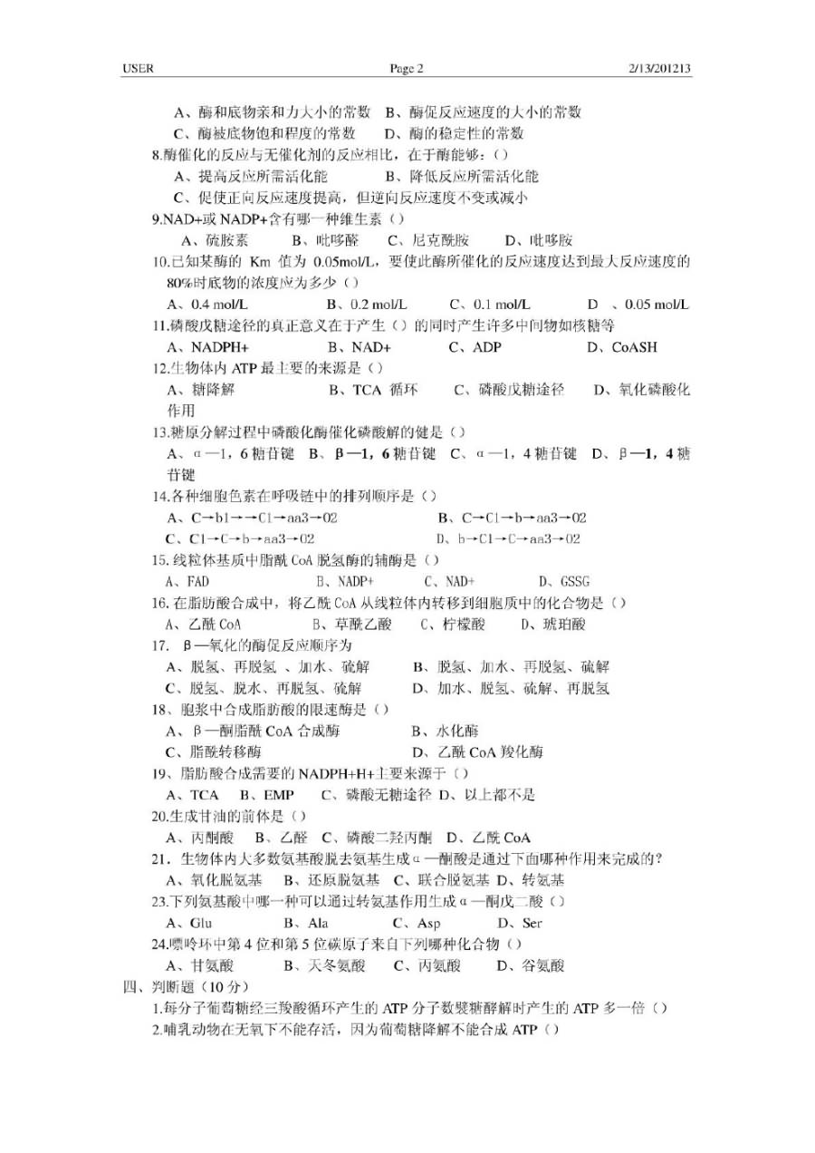 一、名词解释 名词解释 1.蛋白质变性 2.逆转录 3.能荷 4.半保留复制 5.冈崎片段 二、方程式 方程式 1.柠檬酸合酶 2.延胡索酸酶 3.苹果酸脱氢酶 4.6-磷酸葡萄糖内脂酶 5.-酮脂酰硫解酶 6.醛缩酶 三、简答题 简答题 1.简述蛋白质-螺旋的结构特点 2.酶为什么能提高酶促反应的反应速度?酶催化的高 ...