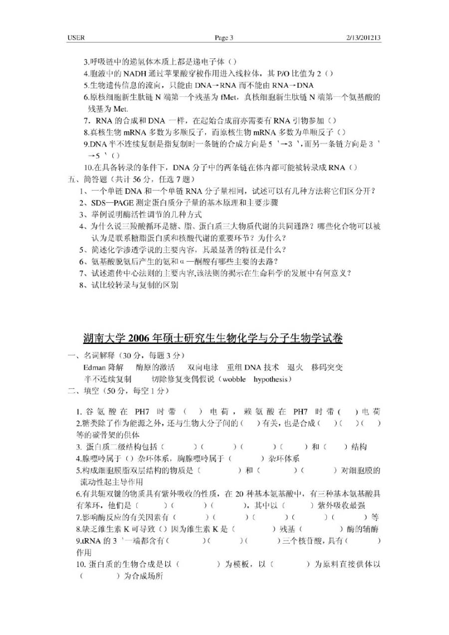 2012年 628生物化学大题 满分150 五、简答题:(每题10分,共50分) 1、PCR的英文全称是什么?在基因进行PCR扩增过程中涉及到哪些要素?其中哪些因素决定了RPC的效率? PCR要素:底物,模板,引物链,DNA聚合酶,Mg离子 2、列举10种蛋白质翻译后化学修饰的方式. 去除信号肽序列,亚基聚合,水解断链 ...