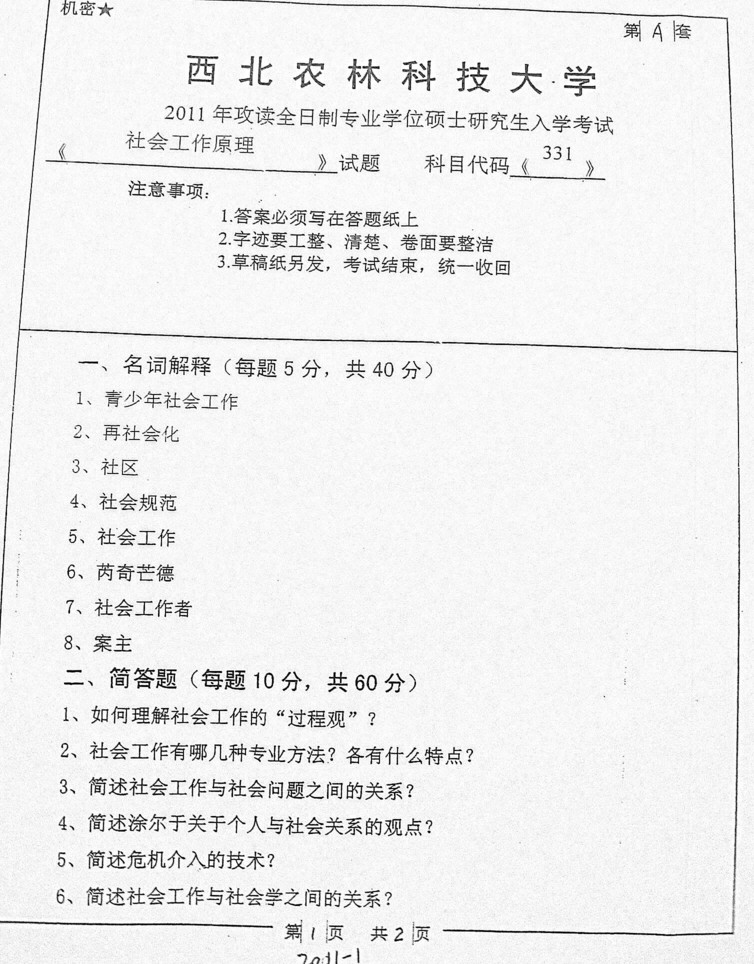 2011西北农林科技大学考研社会工作实务2真题