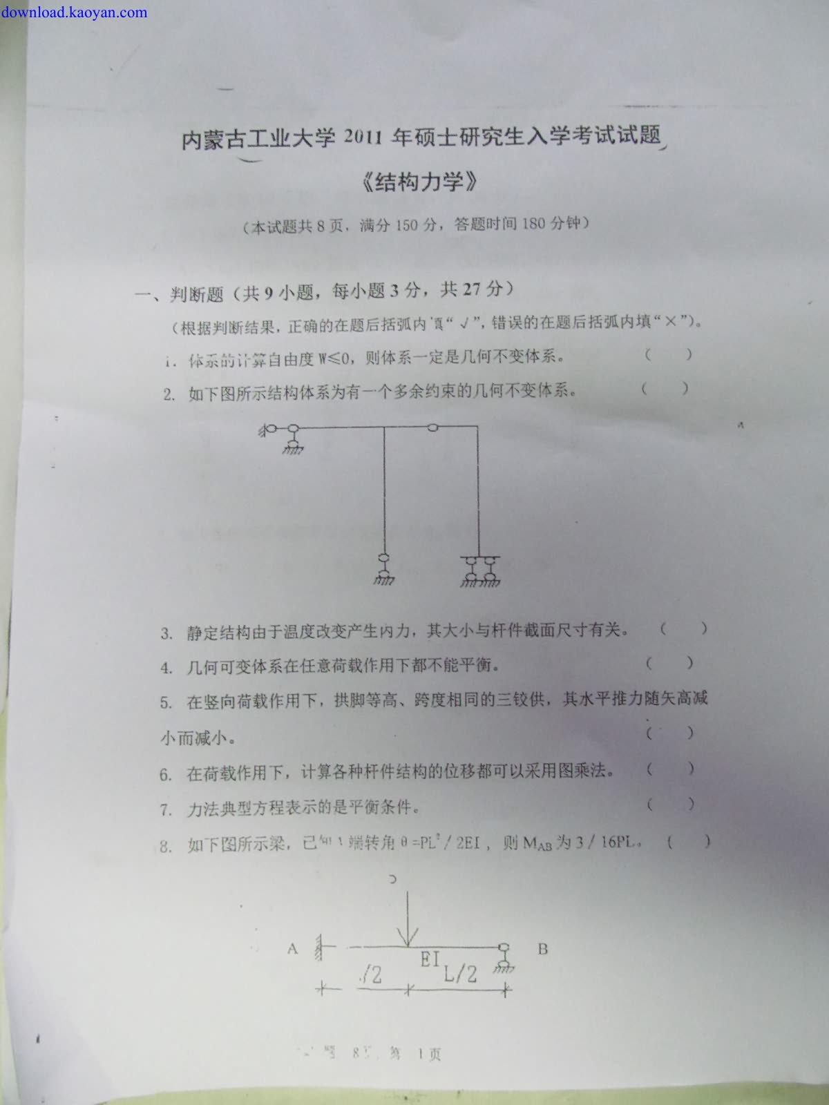 专业课考研资料 本站小编 免费考研网 2016-01-09河海大学2011年硕士研究生结构力学考研真题