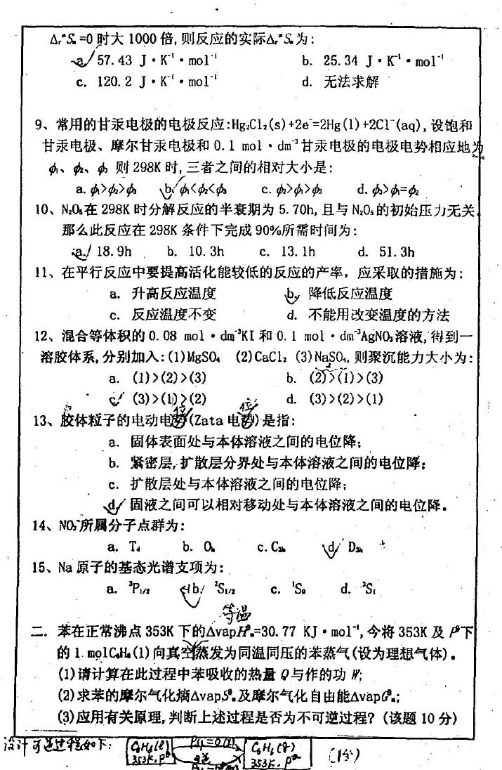 专业课考研资料 本站小编 免费考研网 2015-12-06南京工业大学2015年硕士研究生物理化学复试试题