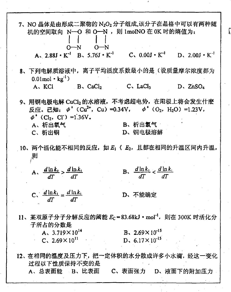专业课考研资料 本站小编 免费考研网 2015-09-192012年浙江大学物理化学(乙)真题