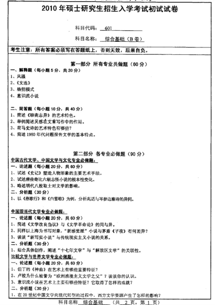考研报考信息 本站小编 免费考研网 2015-12-01中国古代文学史部分(共75分)