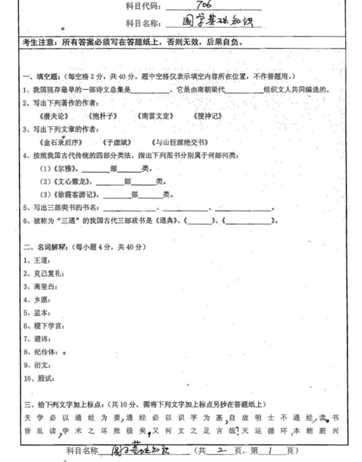 • 2016年南京师范大学中国古典文献学初试真题(回忆版)