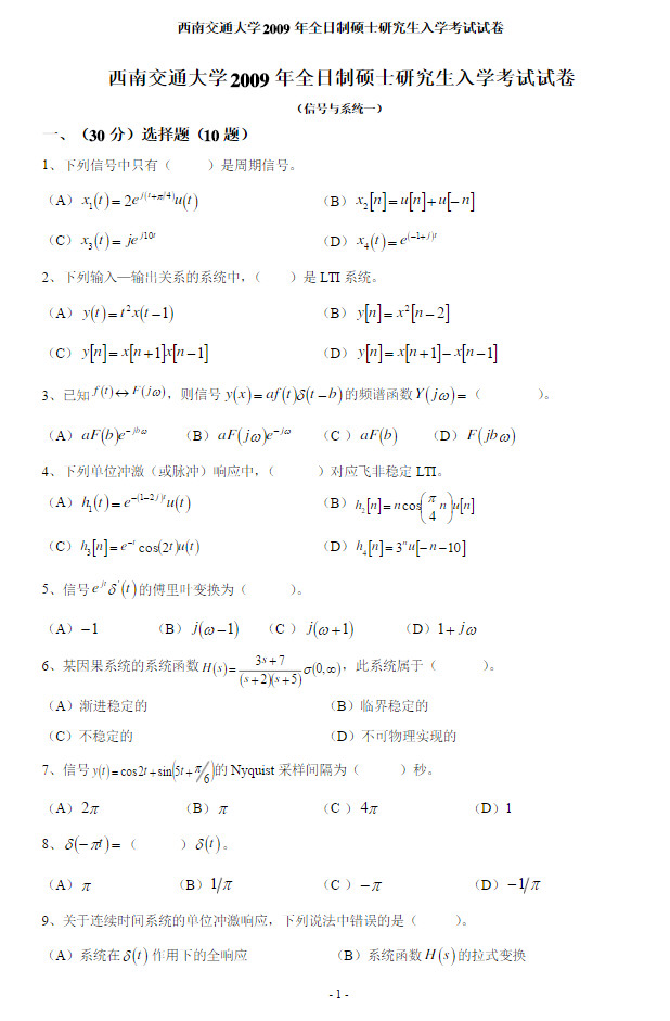 西南交通大学2009年信号与系统考研真题