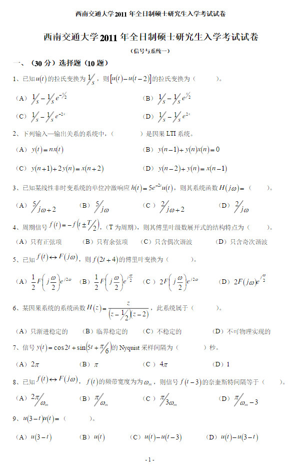专业课考研资料 本站小编 免费考研网 2016-04-04西南交通大学2011信号与系统924考研真题