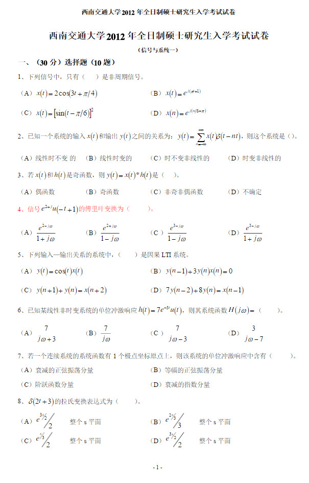 专业课考研资料 本站小编 免费考研网 2016-04-04西南交通大学2010年信号与系统考研真题