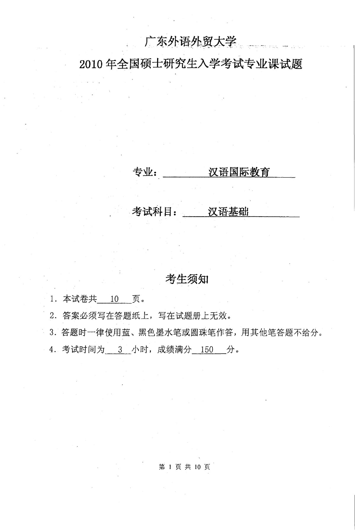 考试科目:汉语基础 考试时间:2010 年 1 月 10 日上午