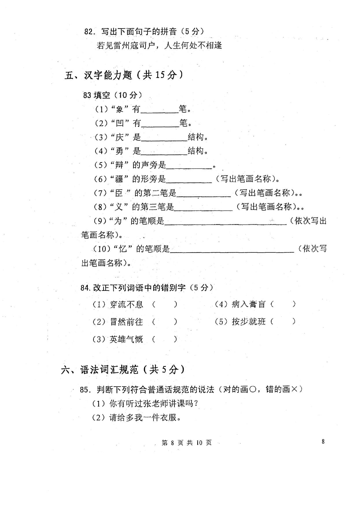 考试科目:汉语基础 考试时间:2010 年 1 月 10 日上午