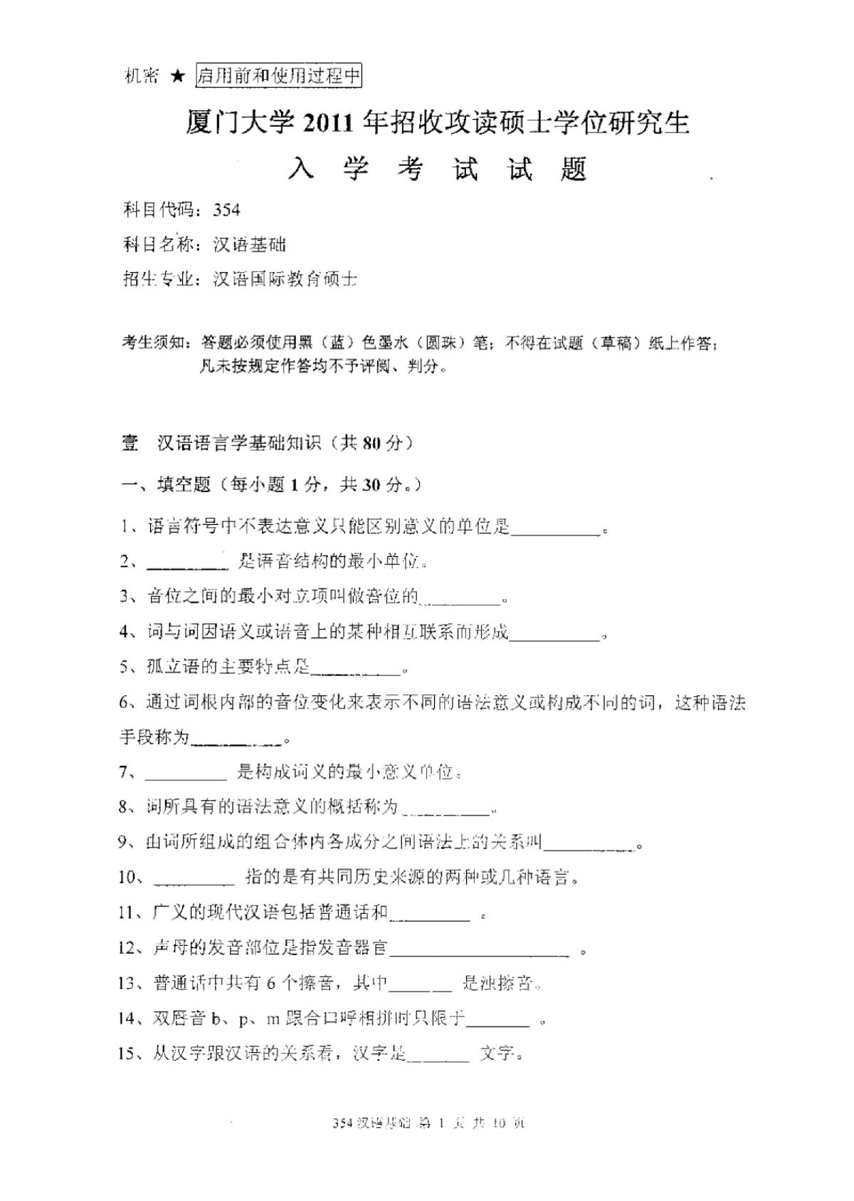 启用前机密 北京大学 2010 年硕士研究生入学考试试题 考试科目:汉语基础 考试时间:2010 年 1 月 10 日上午 招生专业:汉语国际教育硕士 研究方向 请将答案写在答题纸相应的位置上。考试时间为 180 分钟。 壹 汉语语言学基础知识(共 80 分) 一、 填空题(每小题 1 分,共 30 分 但 ...