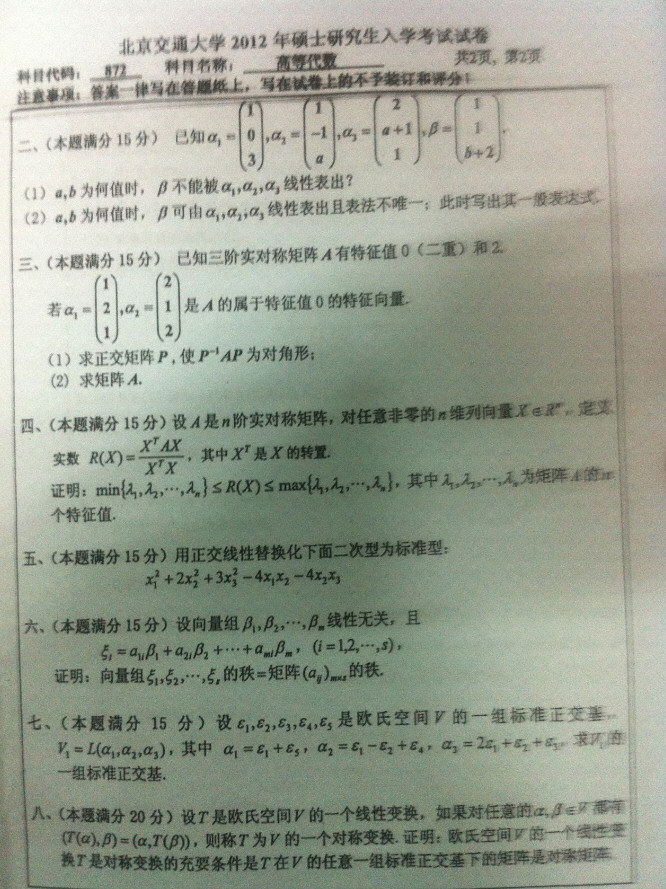 2012年北京交通大学数学分析高等代数考研真题(2)
