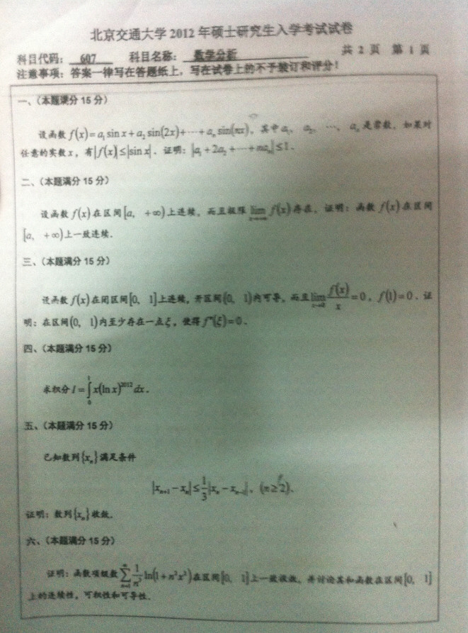 2012年北京交通大学数学分析高等代数考研真题(3)