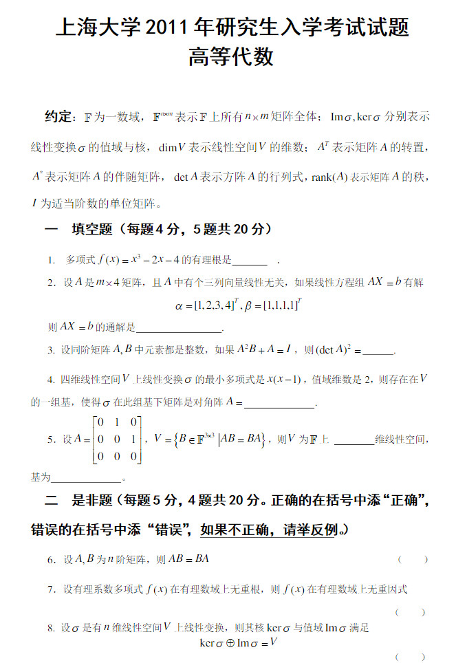 专业课考研资料 本站小编 免费考研网 2016-01-012011-2010年南开大学高等代数考研试题