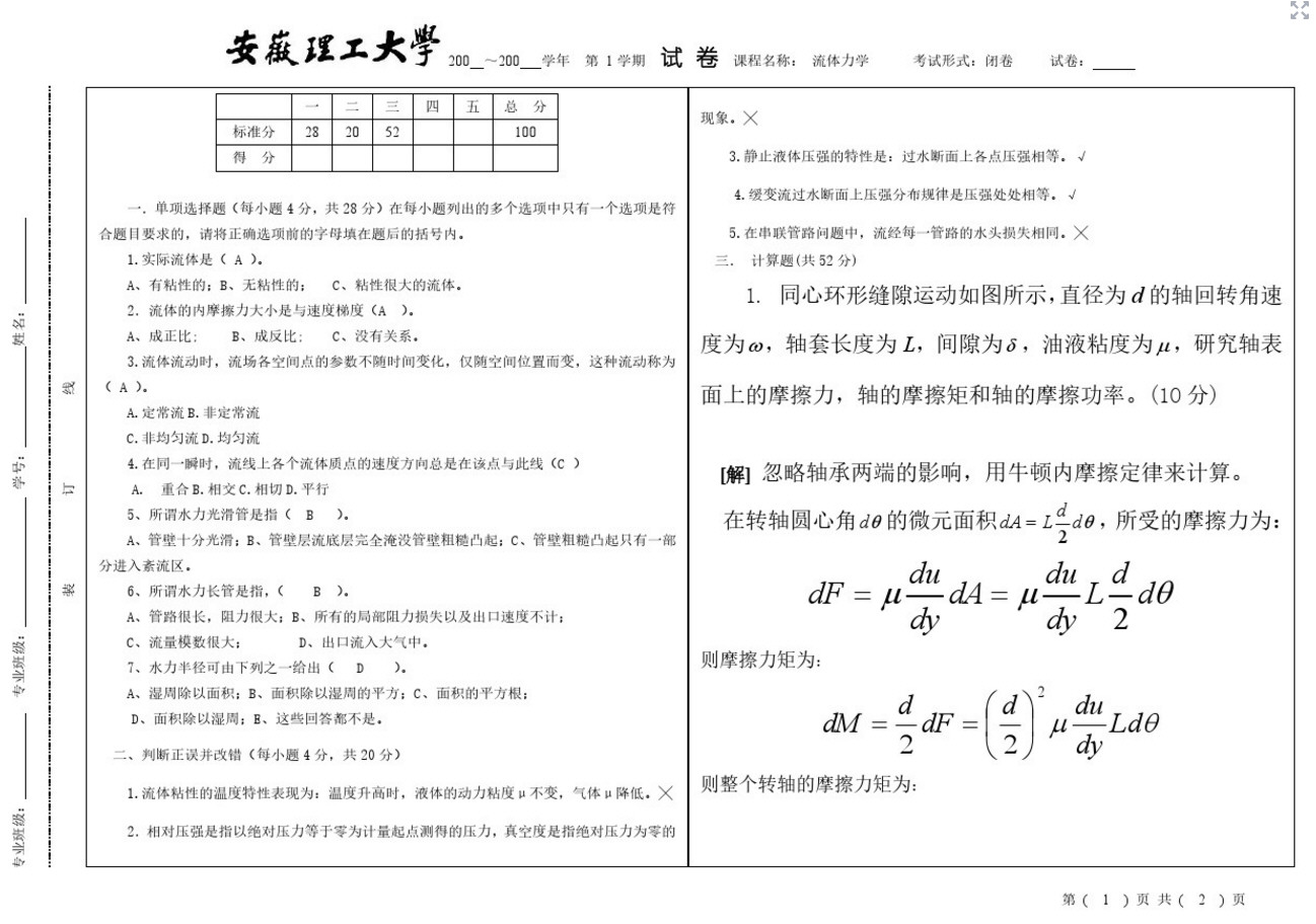 专业课考研资料 本站小编 免费考研网 2015-06-212005年四川大学流体力学试题