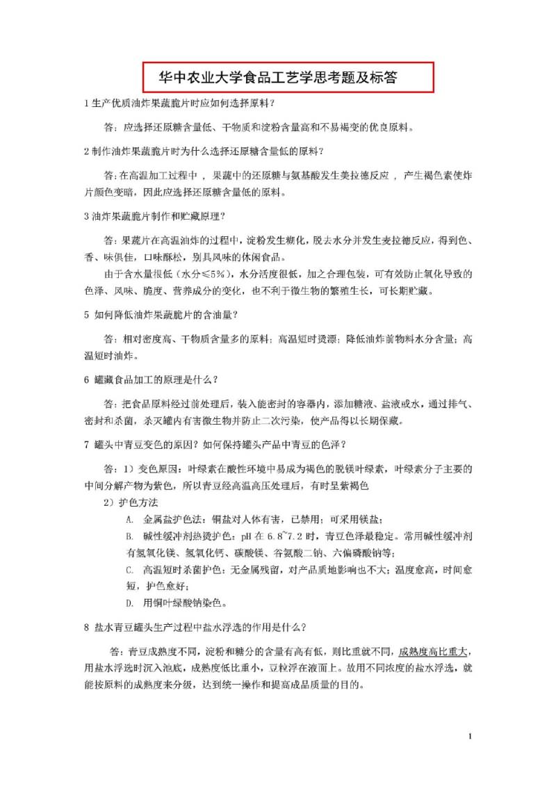 华中农业大学903食品工艺学专硕思考题及标答