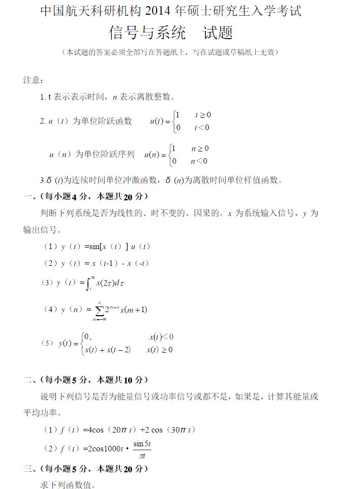 中国航天科研机构2014年信号与系统考研真题