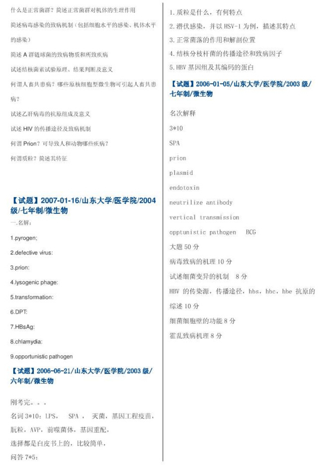 06年微生物复试试题 一, 名词解释(每题3分,共30分) 1,芽孢 某些细菌,特别是G+杆菌,生长到一定阶段,在细胞内形成一个圆形或椭圆形的、折光性强的特殊结构称为芽孢。 2,外毒素,内毒素,类毒素 外毒素细菌细胞在生长繁殖过程中分泌到胞外培养液中的毒性蛋白,主要由G+细菌产生。 内毒素 是G-细菌细胞壁成 ...