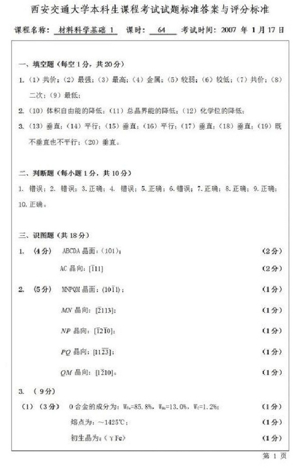 西安交通大学2006-2007学年材料科学基础1考试试题及答案(6)