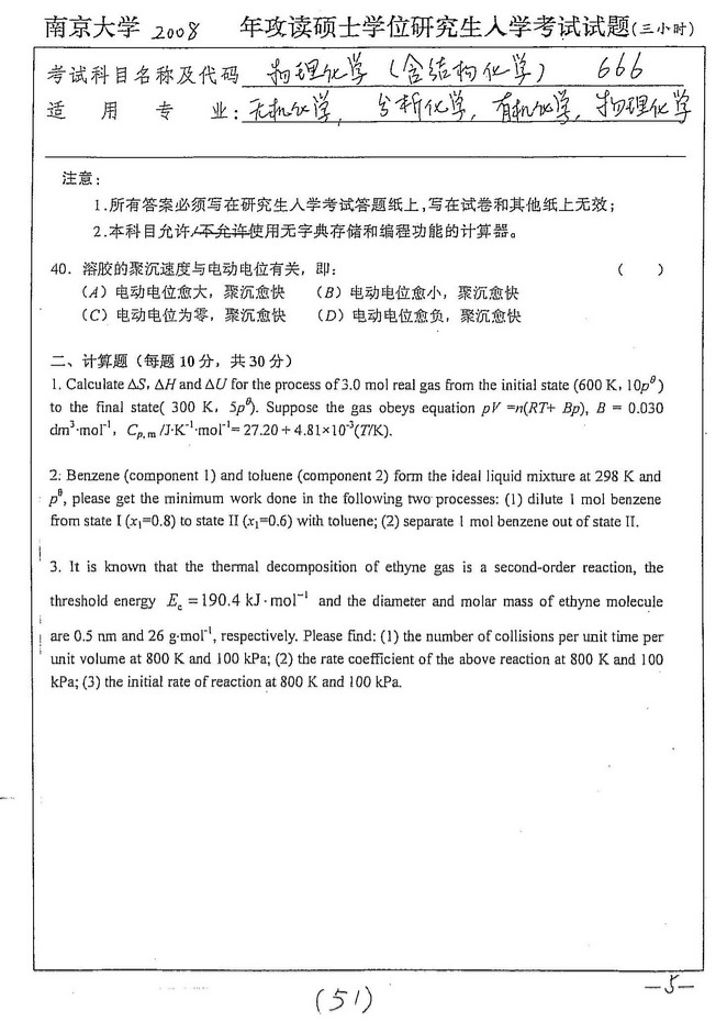 南京大学2008年物理化学(含结构化学) 考研真题及答案(5)