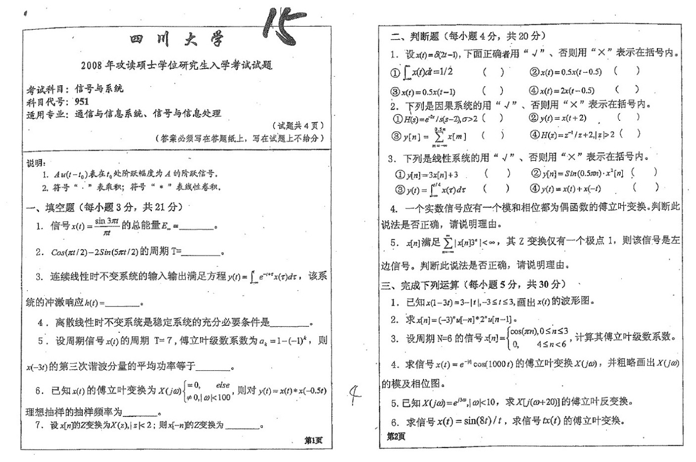 四川大学考研信号与系统(951)2008-2006年考研真题