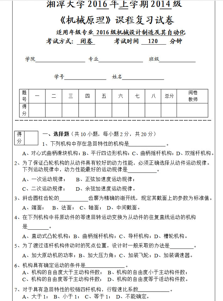 2016年湘潭大学2014级机械学院机械原理复习试卷