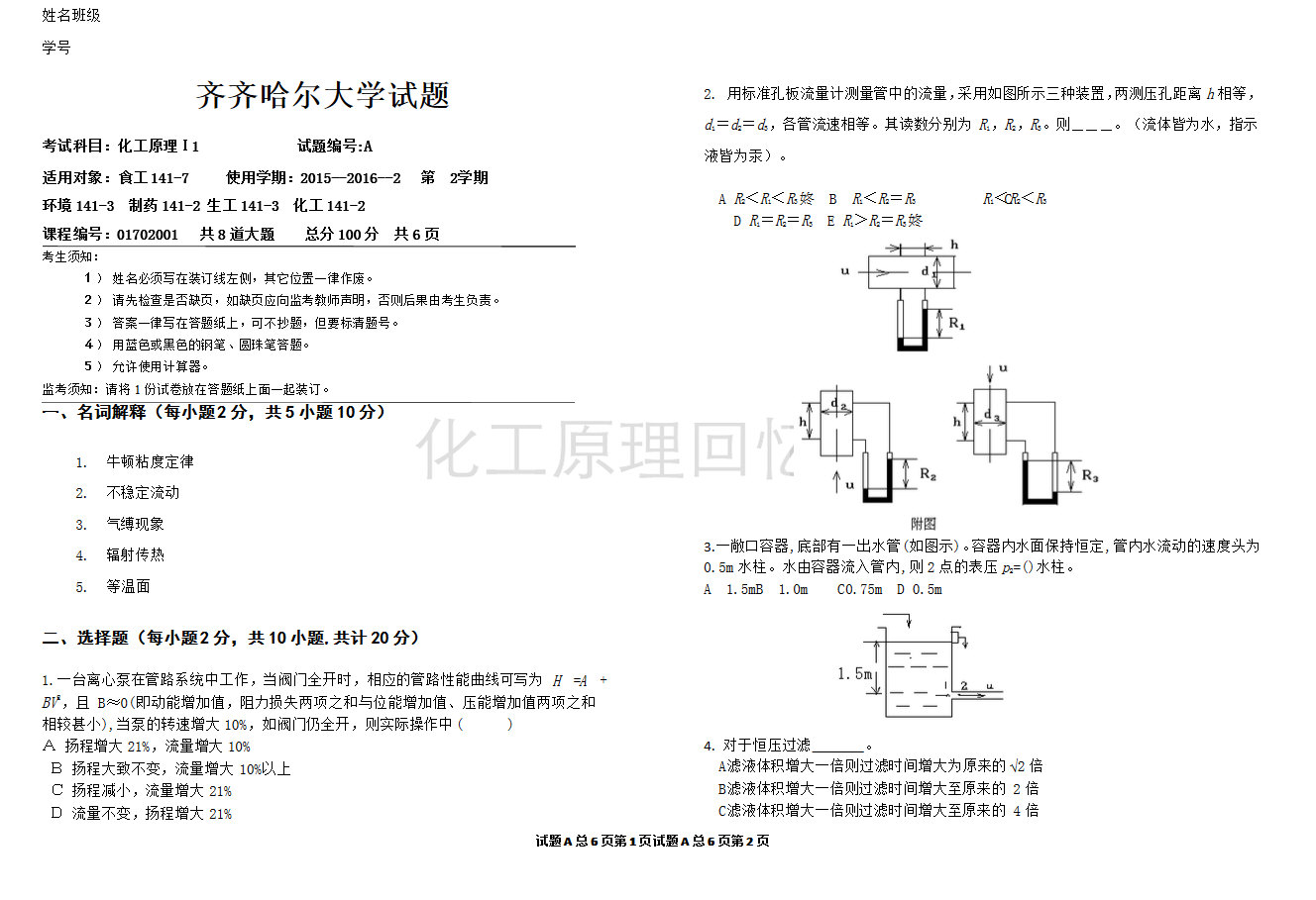 说明:本部分从指定陈敏恒主编的《化工原理》(第4版)为考研参考书目的名校历年考研真题中挑选最具代表性的部分,并对其进行了详细的解答。所选考研真题既注重对基础知识的掌握,让学员具有扎实的专业 ...