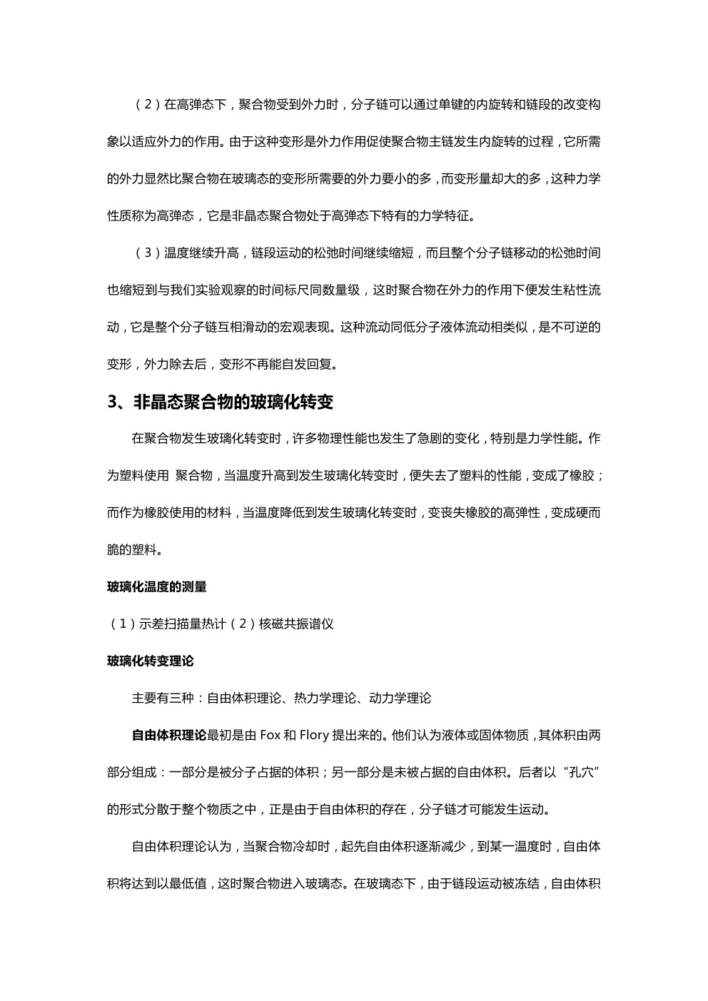 高分子物理 二、高聚物粘性流动有哪些特点?影响粘流温度Tf的主要因素是什么?(8分) 答:粘性流动的特点: 1.高分子流动是通过链段的位移运动来完成的; 2.高分子流动不符合牛顿流体的流动规律; 3.高分子流动时伴有高弹形变。 影响Tf的主要因素: 1.分子链越柔顺,粘流温度越低;而分子链越刚性,粘流温度越高。 ...