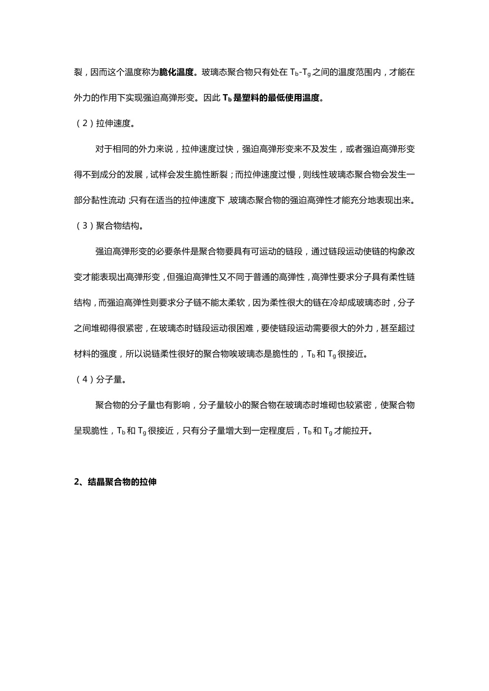 高分子物理 二、高聚物粘性流动有哪些特点?影响粘流温度Tf的主要因素是什么?(8分) 答:粘性流动的特点: 1.高分子流动是通过链段的位移运动来完成的; 2.高分子流动不符合牛顿流体的流动规律; 3.高分子流动时伴有高弹形变。 影响Tf的主要因素: 1.分子链越柔顺,粘流温度越低;而分子链越刚性,粘流温度越高。 ...