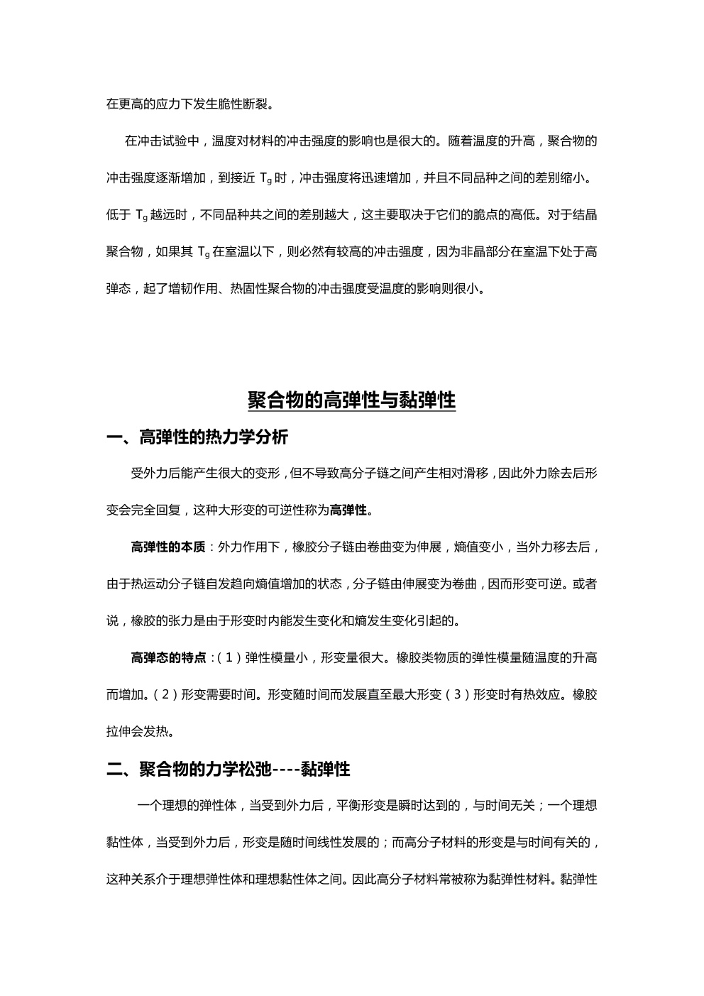高分子物理 二、高聚物粘性流动有哪些特点?影响粘流温度Tf的主要因素是什么?(8分) 答:粘性流动的特点: 1.高分子流动是通过链段的位移运动来完成的; 2.高分子流动不符合牛顿流体的流动规律; 3.高分子流动时伴有高弹形变。 影响Tf的主要因素: 1.分子链越柔顺,粘流温度越低;而分子链越刚性,粘流温度越高。 ...