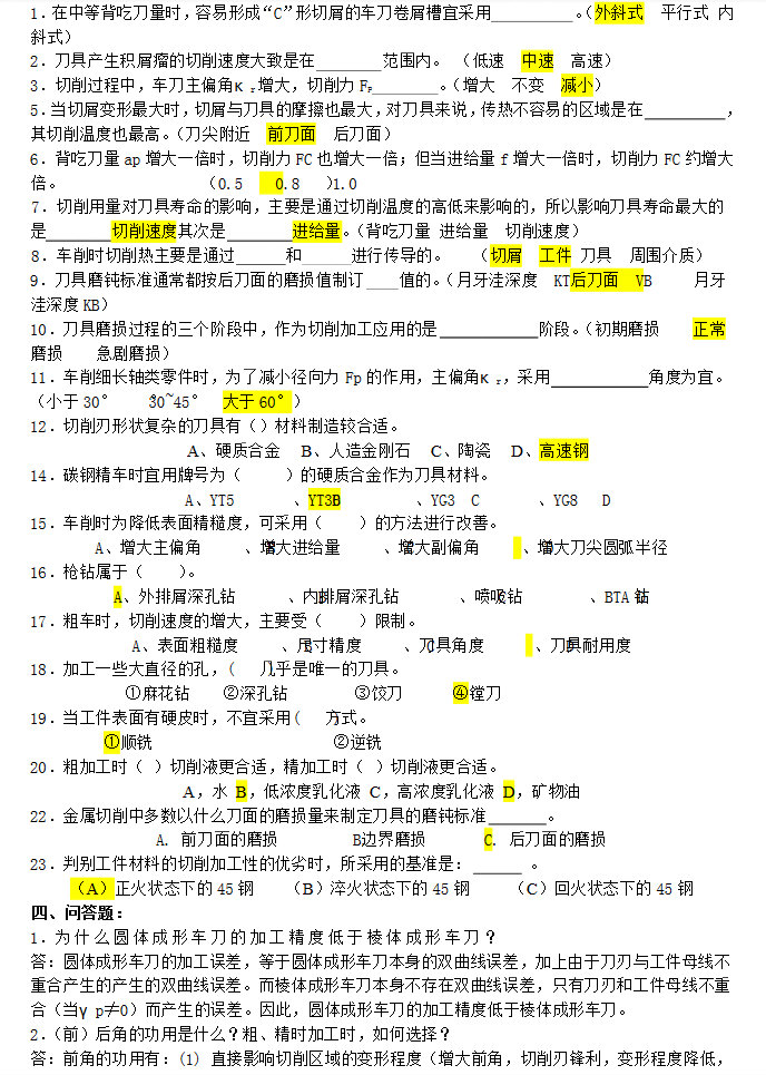 一 填空题 21720311切屑按形成机理可分为_______,_______,_______,_______. 22320321切削力的大小受被加工材料的_______,_______,_______,_______ 的影响. 23120311切削热的来源有_______,_______. 24120311刀具损坏的形式主要有_______和_______. 24120312刀具的磨损形式有_______,_______,_______. 24 120313刀具磨 ...专业课考研资料 本站小编 免费考研网 2016-08-07