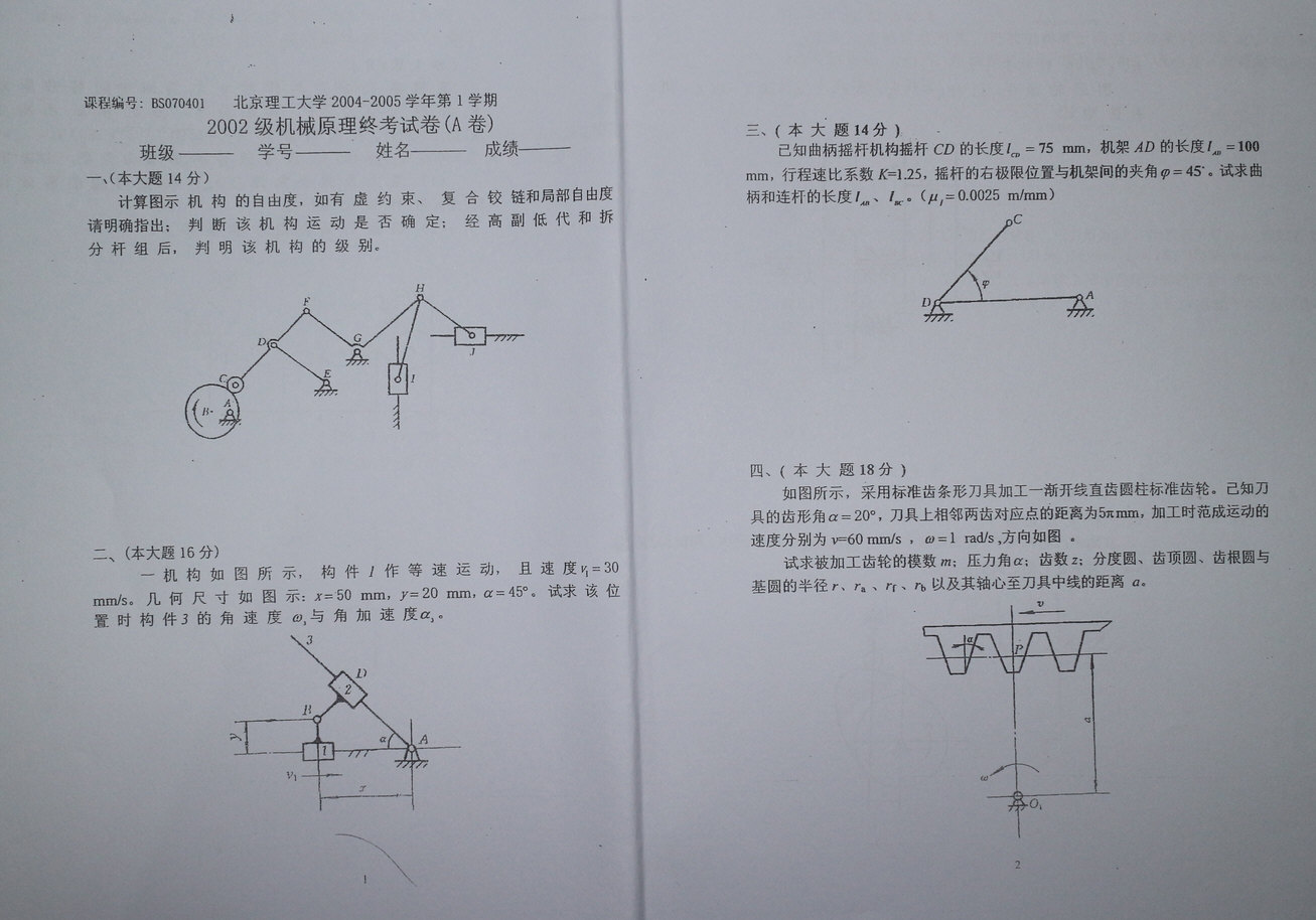 北京理工大学2009,2008,2006机械原理期末考试试卷(4)