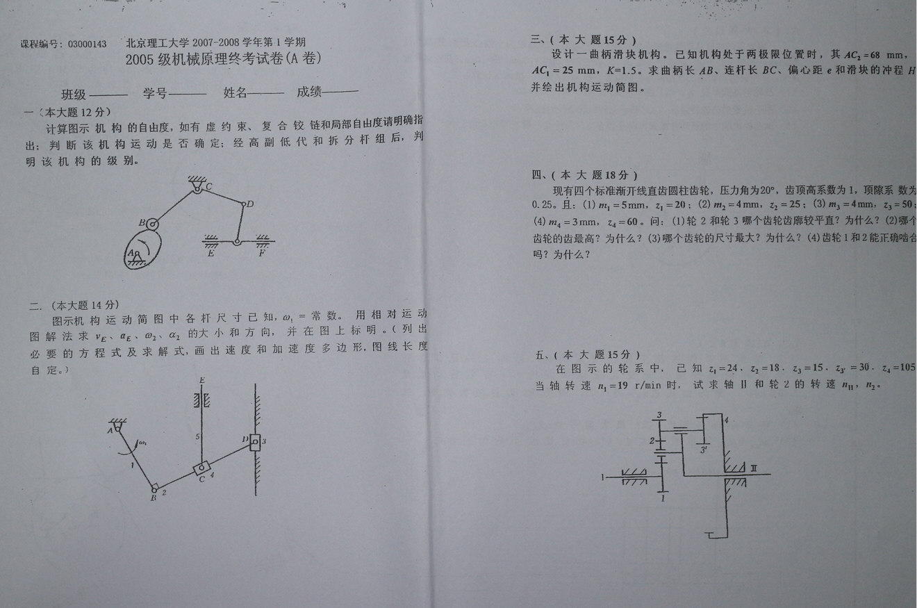 北京理工大学2009,2008,2006机械原理期末考试试卷(6)