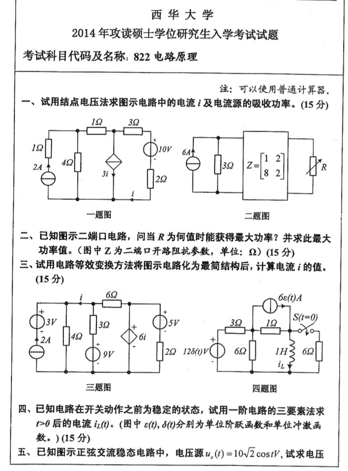 西华大学2013年2014年电路原理(822或者819)考研原题
