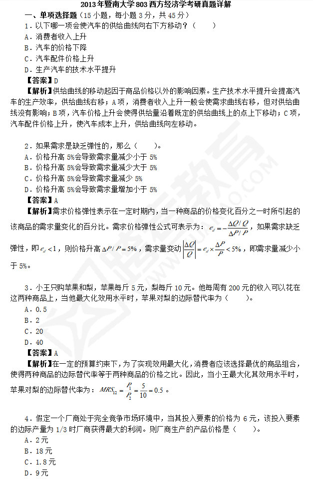1.效用函数U=XY,X的价格为2,Y的价格为3,收入为120。 (1)计算效用最大化的X、Y数量。 (2)计算货币的边际效用以及总效用。 (3)假如X价格上升44%,Y价格不变,消费者欲维持原来的总效用水平,则收入应该变为多少? 备注:这道考题简单,而且和2012年暨南大学803西方经济学一道考题非常相似,没有啥技术含量。 ...
