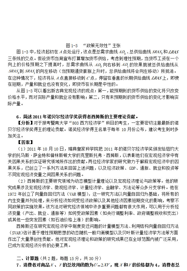 2007年暨南大学西方经济学考研真题 1、简述序数效用理论。请用图示说明。 序数效用理论认为效用的大小是无法具体度量的,效用之间只能根据消费者的偏好程度排列顺序或等级,这种以排序的形式来衡量的商品的效用就是序数效用。序数效用论是用无差异曲线和预算线来共同描述消费者均衡,即在无差异曲线和预算线的切点位置 ...