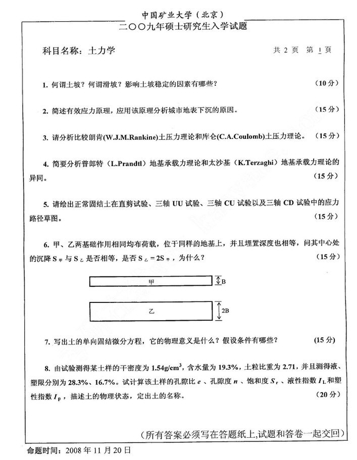 名词解释:五个:孔隙比,应力路径,变形模量,---------,--------(20分) 选择题:五个:有两道以前考过,三道计算,具体啥记不清了。(20分) 简答题:四个,1、使用有效应力原理说明有效应力、孔隙压力和沉降随时间的变化;(40分)