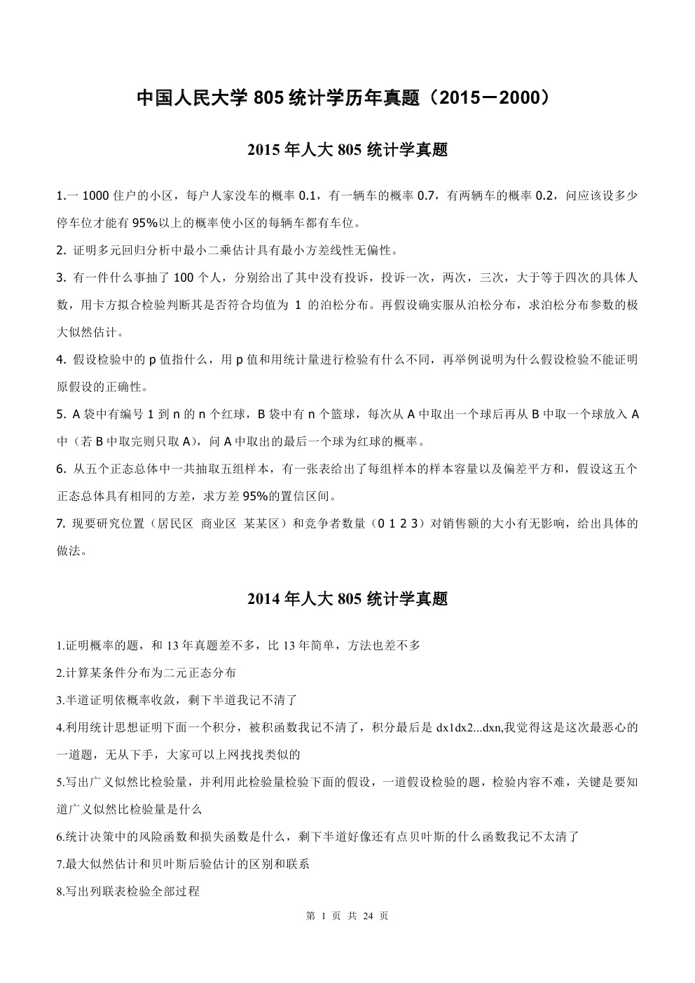 中国人民大学2000-2015年统计学805考研真题