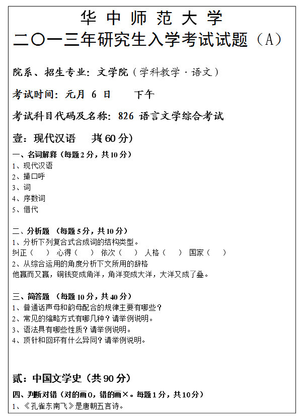 2014年826学科语文真题 现代汉语 一、名词解释(10分) 语言 合作原则 调值 同形异音词 二、分析(10分) 1、 分析下列短语的结构类型(5个短语) 2、 分析多重复句 虽然我今天又会晚回去,但是因为我是她的儿子,妈妈不会怪我,会原谅我。 三、简答题 1、 同义词可以从哪几个方面辨析? 2、 ...