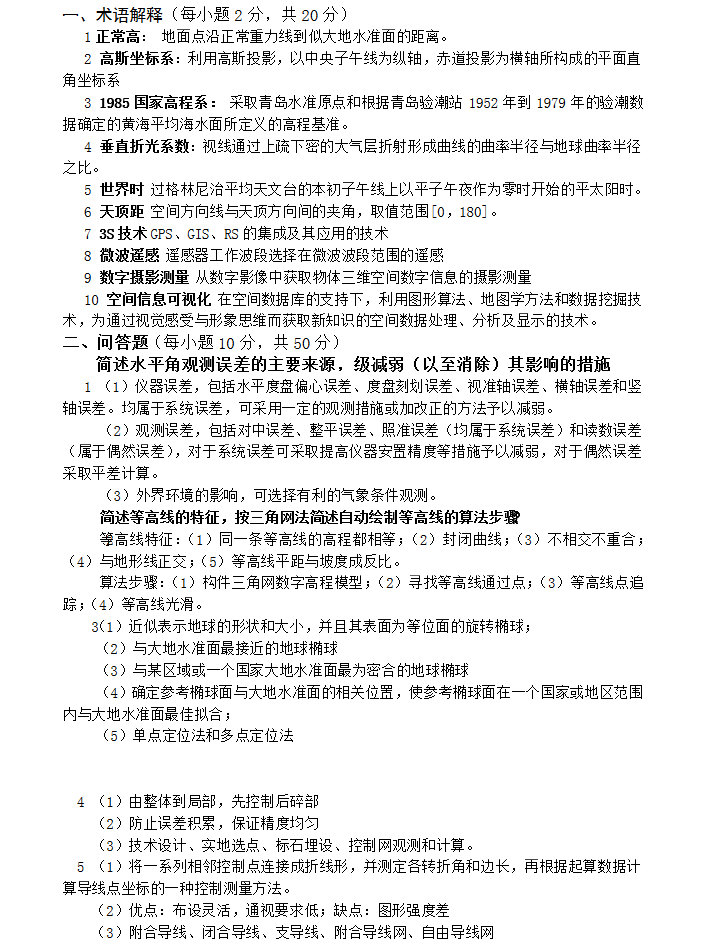 2016武汉大学大地测量学基础考研真题 一. 名词解释(每小题5分,共六小题,共30分) 重力异常 章动 高斯投影 甚长基线干涉测量 控制网的可靠性 测距仪周期误差 二. 多项选择(每小题4分,共10小题,共40分) 1. 以下说法正确的是() A 地轴的方向在空间的指向是变化的 B 地轴在地球内部存在相对位移 C ...