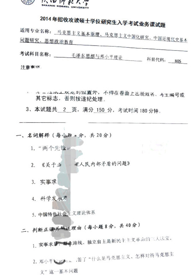 2014年陕西师范大学805毛泽东思想与邓小平理论考研真题