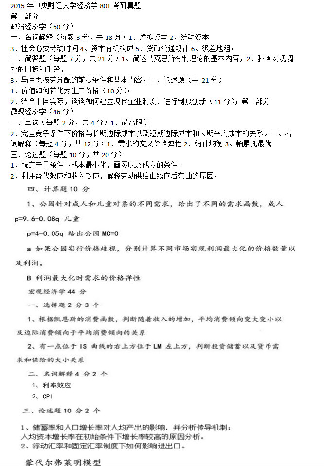 2015 2016 年中央财经大学经济学801考研真题