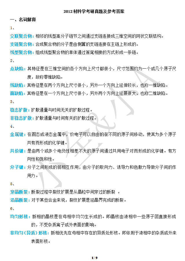 • 西北工业大学2012年材料科学基础考研真题与答案
