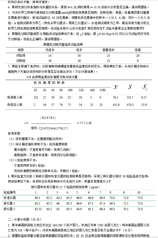 真题简答题和计算题 2010年 1.简述地方病的体征。 ①该地区的各类居民,任何民族其发病率均高; ②在其他地区居住的相似的人群中,该病的发病频率均低,甚至不发病; ③迁入该地区的人经一段时间后,其发病率与当地居民一致; ④人群迁出该地区后,发病率下降或患病症状减轻或自愈; ⑤ ...